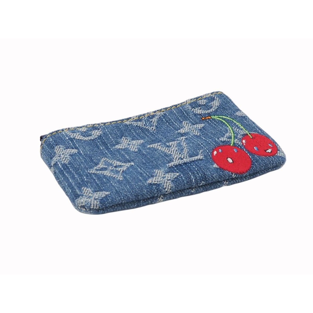 N LOUIS VUITTON ルイ ヴィトン LV×TM カードキーケース ポシェット クレ モノグラム チェリー デニム コットン レザー 刺繍 キーケース コインケース フック付きチェーン ブルー 村上隆 ゴールド金具 M 14938