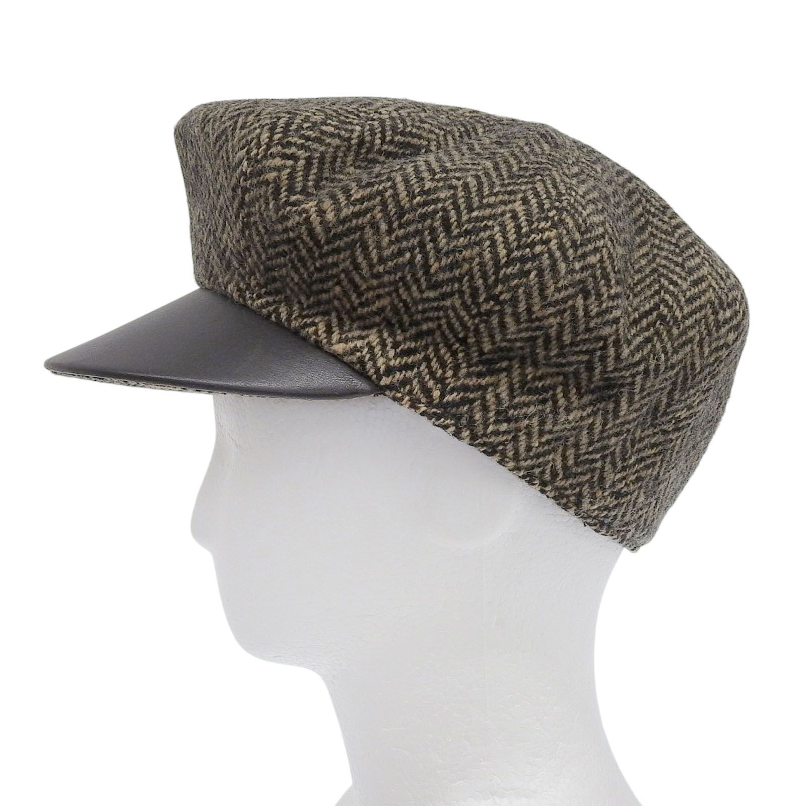HERMES エルメス ウール カシミヤ ディアレザー使い ヘリンボーン柄 ツイード キャスケット 帽子 ブラウン 56 フランス製 レディース