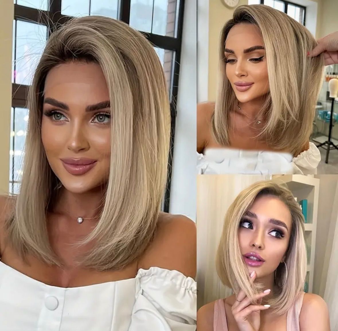 広範囲レース 人毛 人毛ウィッグ フルウィッグ かつら レースウィッグ 手植えウィッグ 医療用ウィッグ 自然 アッシュブロンド 金髪 明るめ ブリーチ ショート ボブ セミロング 前髪なし グラデーション ベージュ
