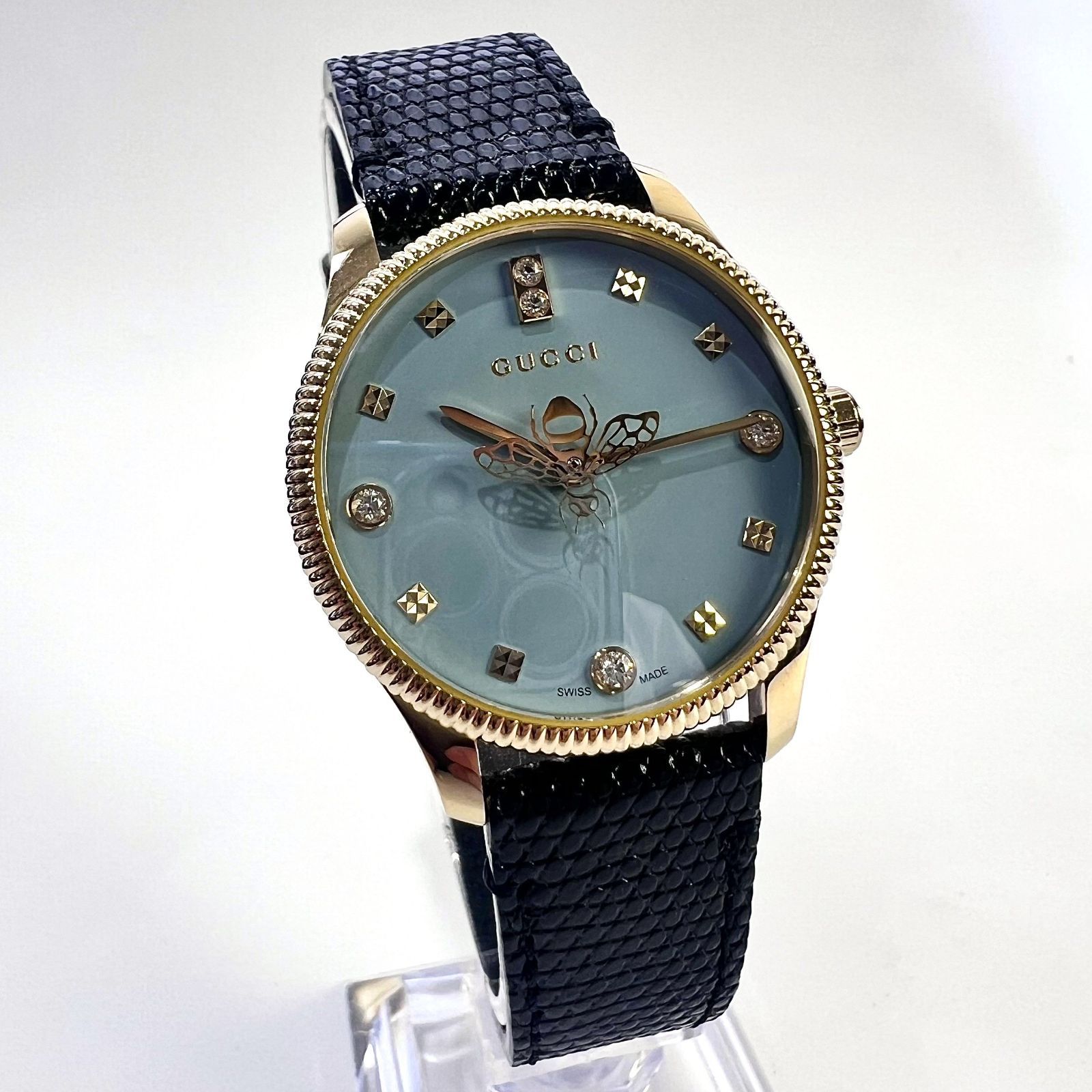 GUCCI グッチ Gタイムレス 5 P ダイヤ 蜂モチーフ レディース クオーツ 青文字盤 腕時計 126.5 リザード 29 mm 箱 稼働中 aua