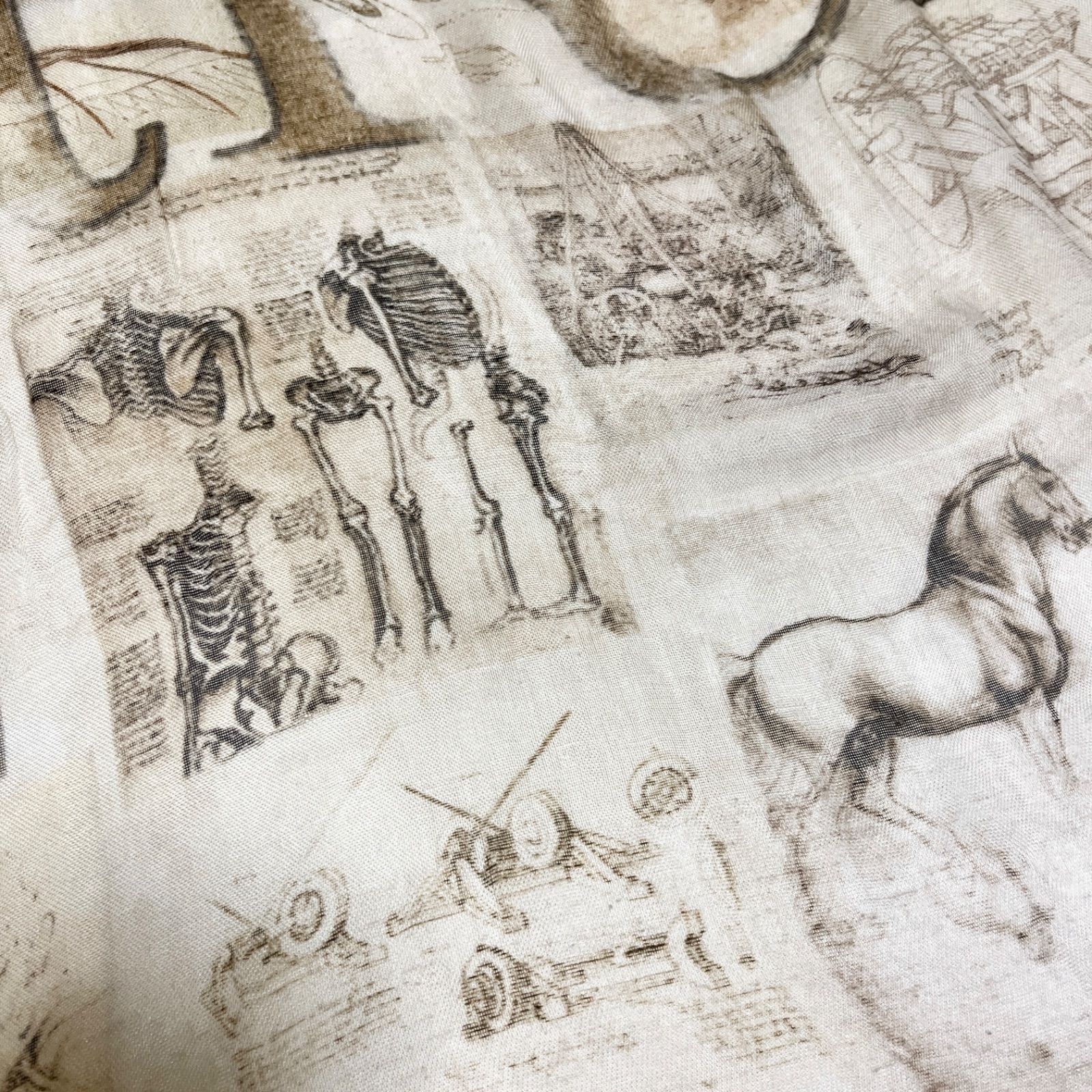 スフォルツァ騎馬像、人体解剖図(ウィトルウィウス的人体図)、兵器設計図といった彼の代表的スケッチが繊細にプリントされた、極めて希少なデザインです。