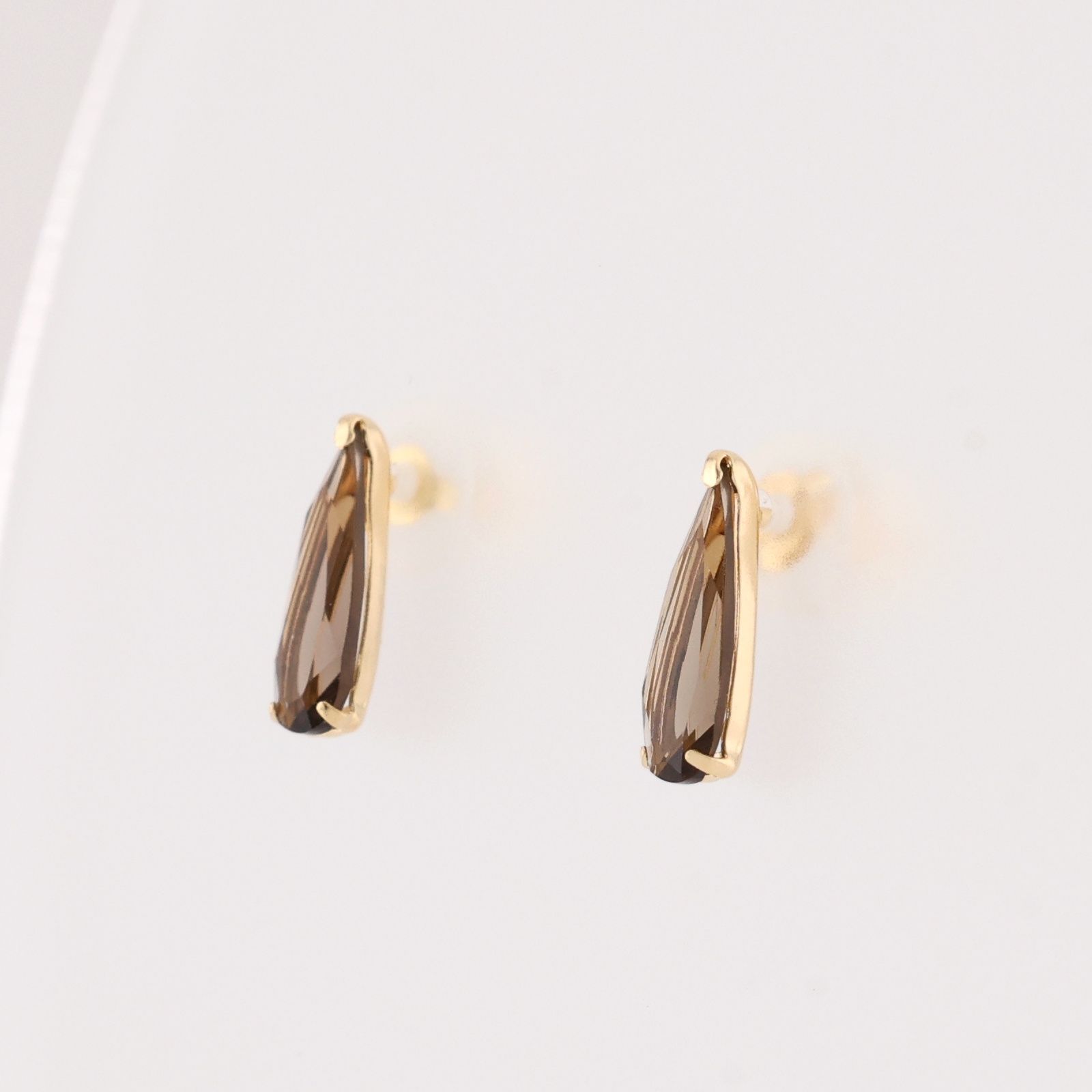 高級感のあるK18ゴールドと、落ち着いた輝きを放つスモーキークオーツを組み合わせた、シンプルながらも洗練されたスタッドピアスです。縦に長い細身のしずく型のスモーキークオーツのシルエットは、耳元に上品な縦ラインを強調し、繊細でエレガントな印象を作ります。その特有のシックで透明感のあるブラウンカラーが、光の加減で微妙に色合いを変えて、落ち着いた雰囲気を演出します。どんな肌色にも調和し、オフィススタイルにもカジュアルスタイルにも合わせやすい万能カラーが魅力です。その輝きを最大限に引き出すために、石留めには極力主張をおさえた3本爪を採用し、スモーキークオーツの美しさを際立たせています。K18ゴールドの輝きとスモーキークオーツの魅力が詰まったピアスは、本物志向の方におすすめです。どんなシーンにも溶け込むシンプルでシックな輝きを、是非毎日のコーディネートに取り入れてみてください。