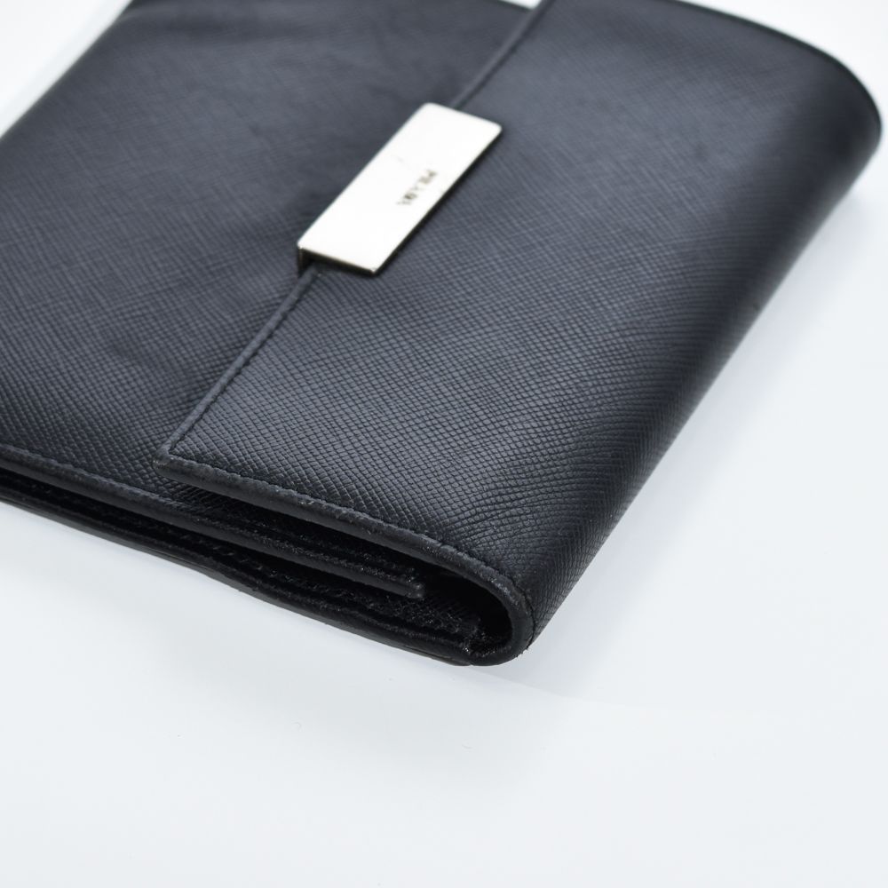 PRADA 定番のサフィアーノレザー。カードやお札が出しやすく、シンプルで高級感のあるデザインです。全体的に若干のシワやスレがあり。ロゴプレートに小傷が見受けられます。ご使用には問題ございませんので、まだまだご愛用頂けるコンディションです。