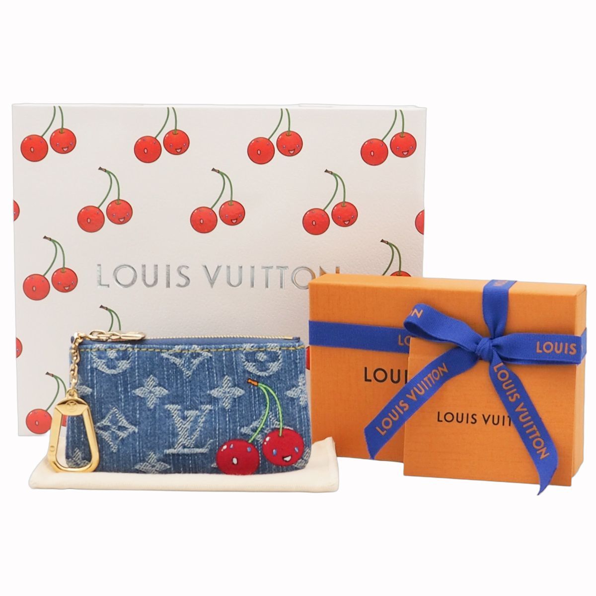 N LOUIS VUITTON ルイ ヴィトン LV×TM カードキーケース ポシェット クレ モノグラム チェリー デニム コットン レザー 刺繍 キーケース コインケース フック付きチェーン ブルー 村上隆 ゴールド金具 M 14938