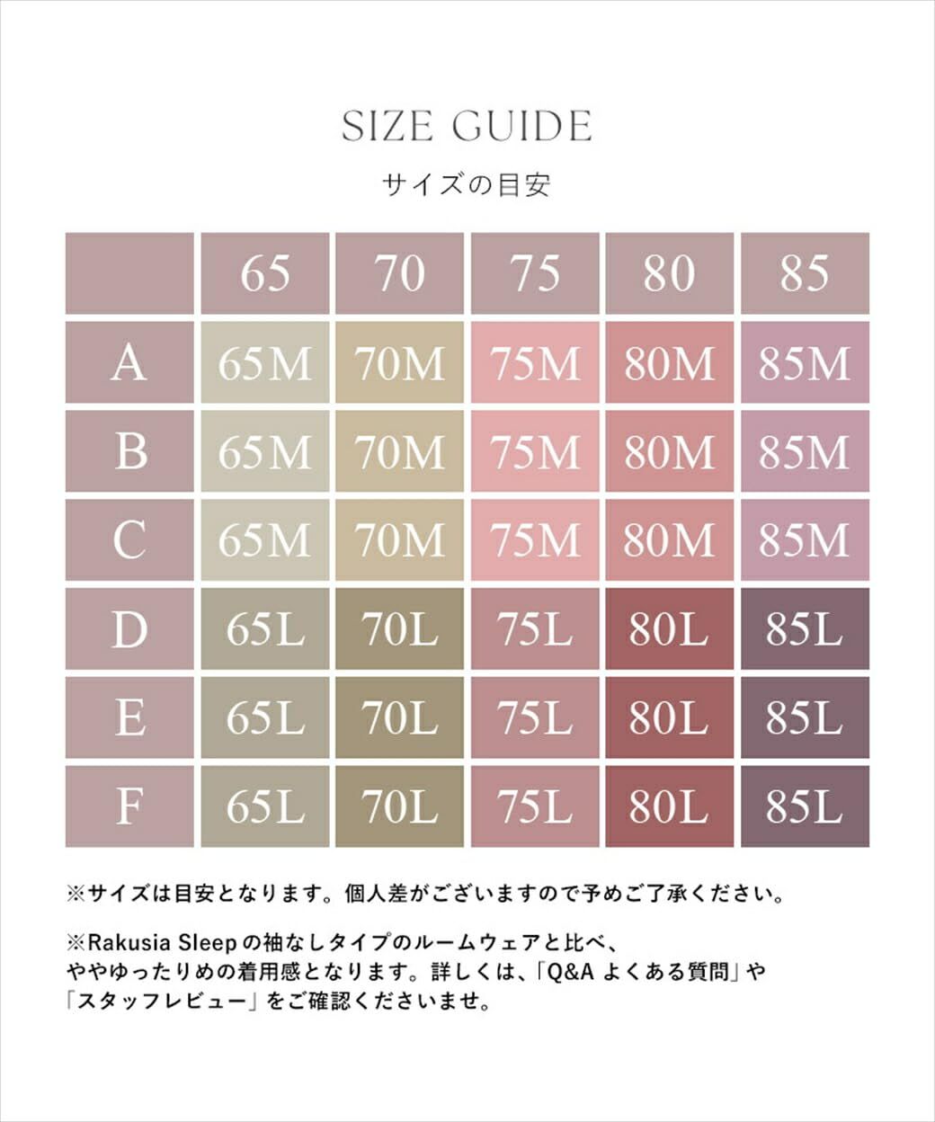 [対応サイズ]65M:A65 B65 C65、65L:D65 E65 F65、70M:A70 B70 C70、70L:D70 E70 F70、75M:A75 B75 C75、75L:D75 E75 F75、80M:A80 B80 C80、80L:D80 E80 F80、85M:A85 B85 C85、85L:D85 E85 F85 ※対応サイズは目安となります。個人差がございますので予めご了承ください。 ※Rakushia Sleepの袖なしタイプルームウェアに比べ、ややゆったりめの着用感となります。