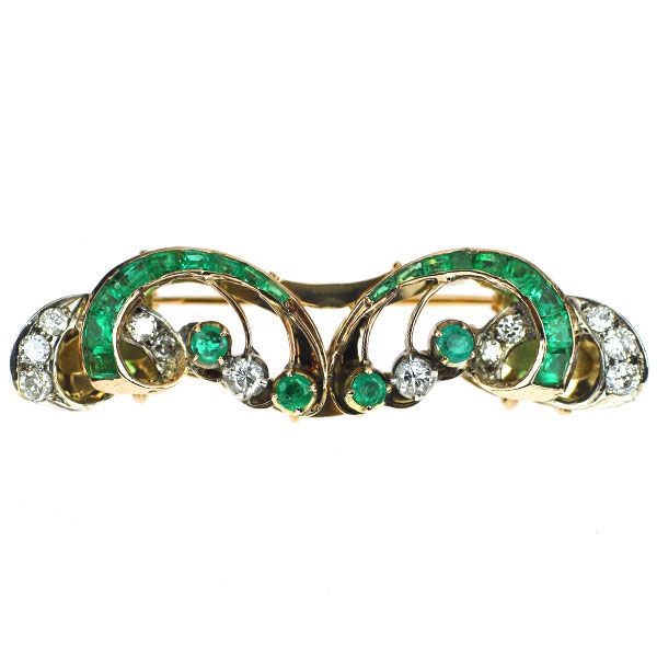 シンメトリーな曲線のモチーフにカリブレカットエメラルドとダイヤモンドを飾った、アンティークなデザインブローチです。