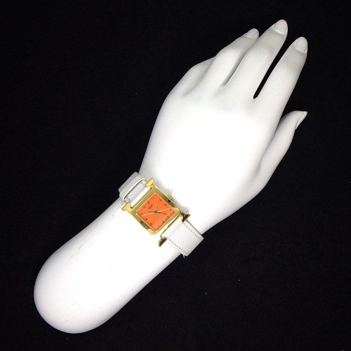 エルメス HERMES 腕時計 Hウォッチ HH 1.201 スクエア オレンジ文字盤 GP SS ホワイト ヴォー エプソン レザーベルト クオーツアナログ