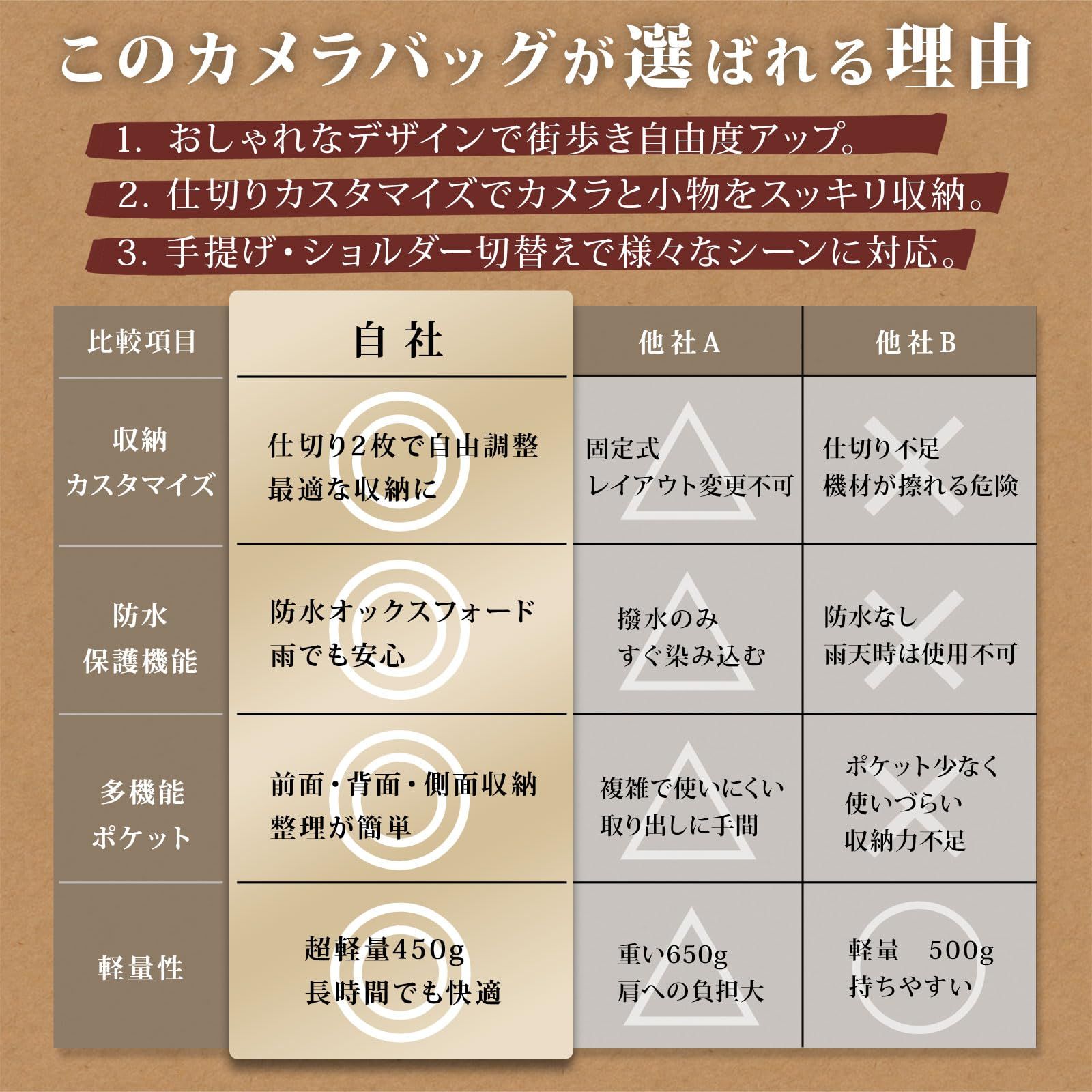 【多機能2WAYデザイン】取り外し可能な仕切り板2枚と前面・背面・側面ポケットで機材とアクセサリーを自在に整理。防水オックスフォード生地が突然の雨からカメラを守ります。手提げとショルダーの2way仕様で、カフェ巡りから本格撮影まで幅広いシーンに対応。おしゃれと機能性を両立した、毎日使いたくなるカメラバッグです。