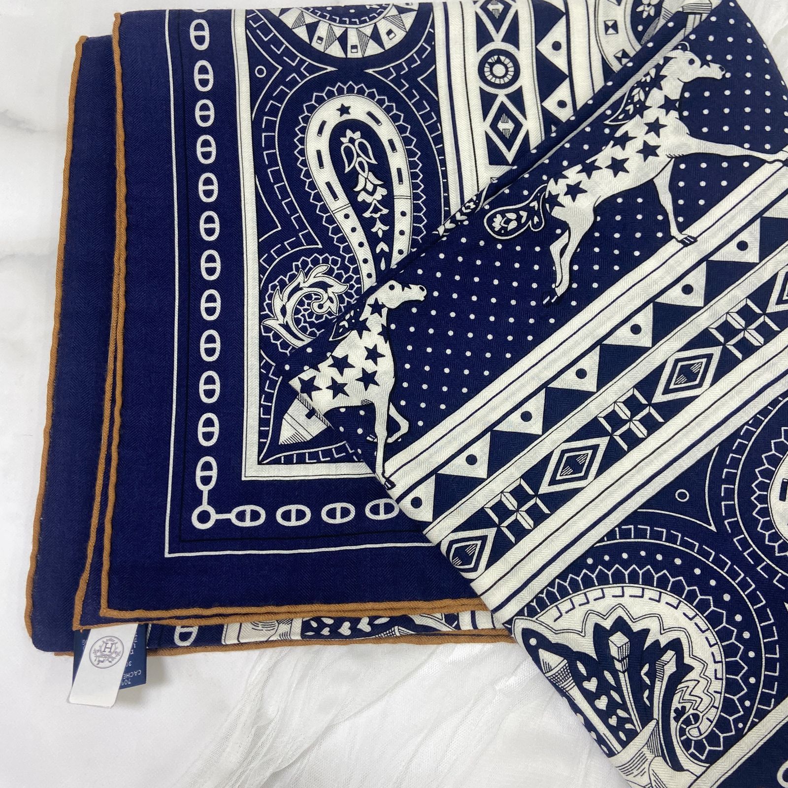 鑑定済み エルメス シュヴァル ドゥ クール バンダナ ネイビー ホワイト ブラウン カシシル ストール