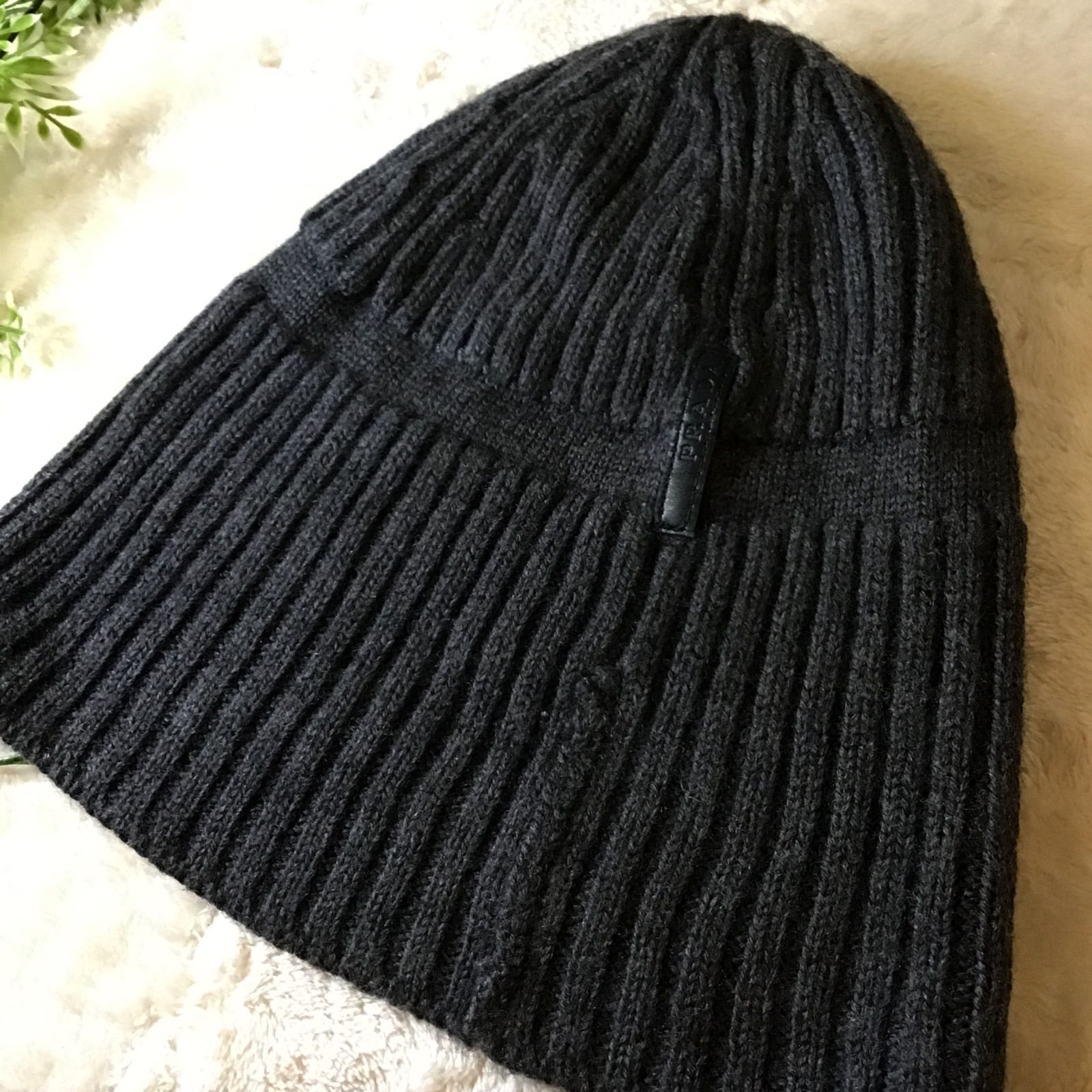 ダークグレーのリブ編みニット帽、PRADAのタグ付き。