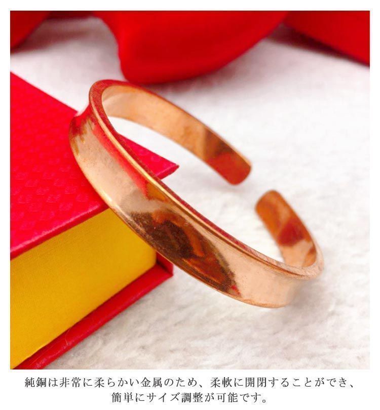 純銅は非常に柔らかい金属のため、柔軟に開閉することができ、簡単にサイズ調整が可能です。フリーサイズで自身の手首に合わせて調節が可能なので、プレゼントや、男女のペアアクセサリーとしての使用もぴったりです。快適な着け心地と高級感のあるシンプルなルックスが魅力で、日常のファッションにさりげないアクセントを加えます。