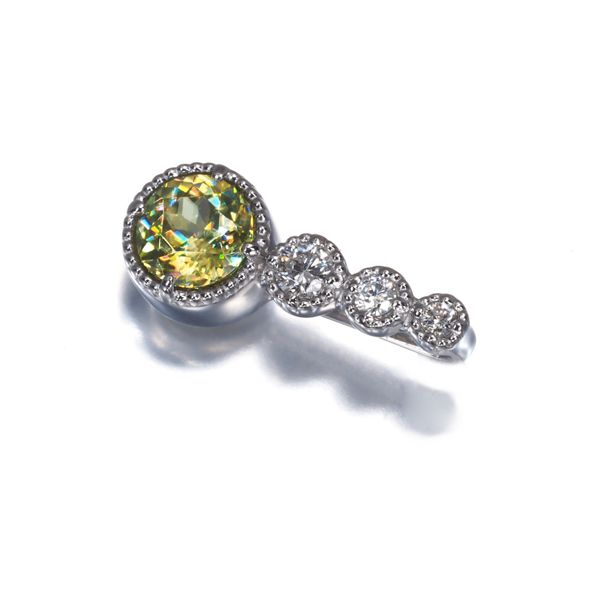 1滴のグリーンを注いだ鮮やかなイエローのお色味と素晴らしい透明感に溢れる虹色のファイアが眩いスフェーンの輝きを、細やかなミルグレイン細工に飾った上品なペンダントトップ。3石のダイヤモンドが上品な煌めきを添えていますね。