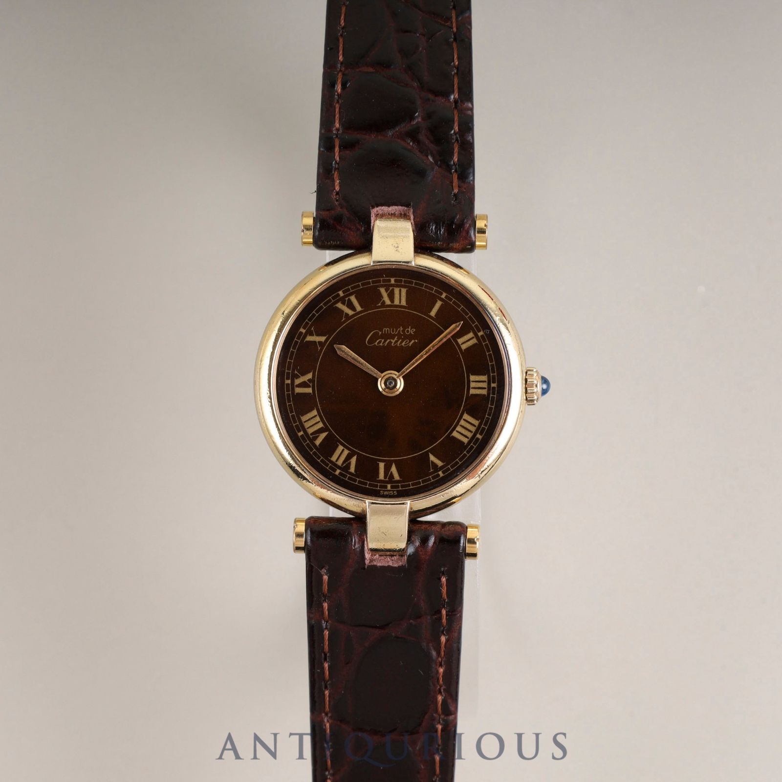 カルティエ マスト ヴァンドーム VLC SM 18 クォーツ Cal.81 SV 925 革 尾錠 GP マホガニーローマン文字盤 箱 オーバーホール済み
