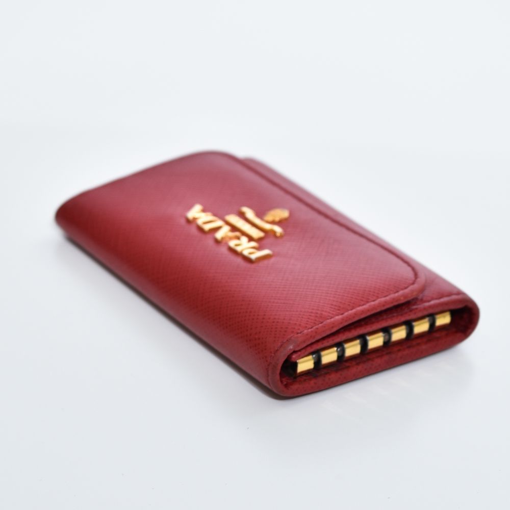 PRADA 定番のサフィアーノレザーキーケース。鮮やかなレッドカラーで、一際目を引くデザインです。6連なので使い勝手も◎金具スレや角スレ、内側に押し跡があり、全体的な型崩れなどの使用感はございますがご使用上問題ございません。レザーにへたりも無く、まだまだご愛用いただけます。