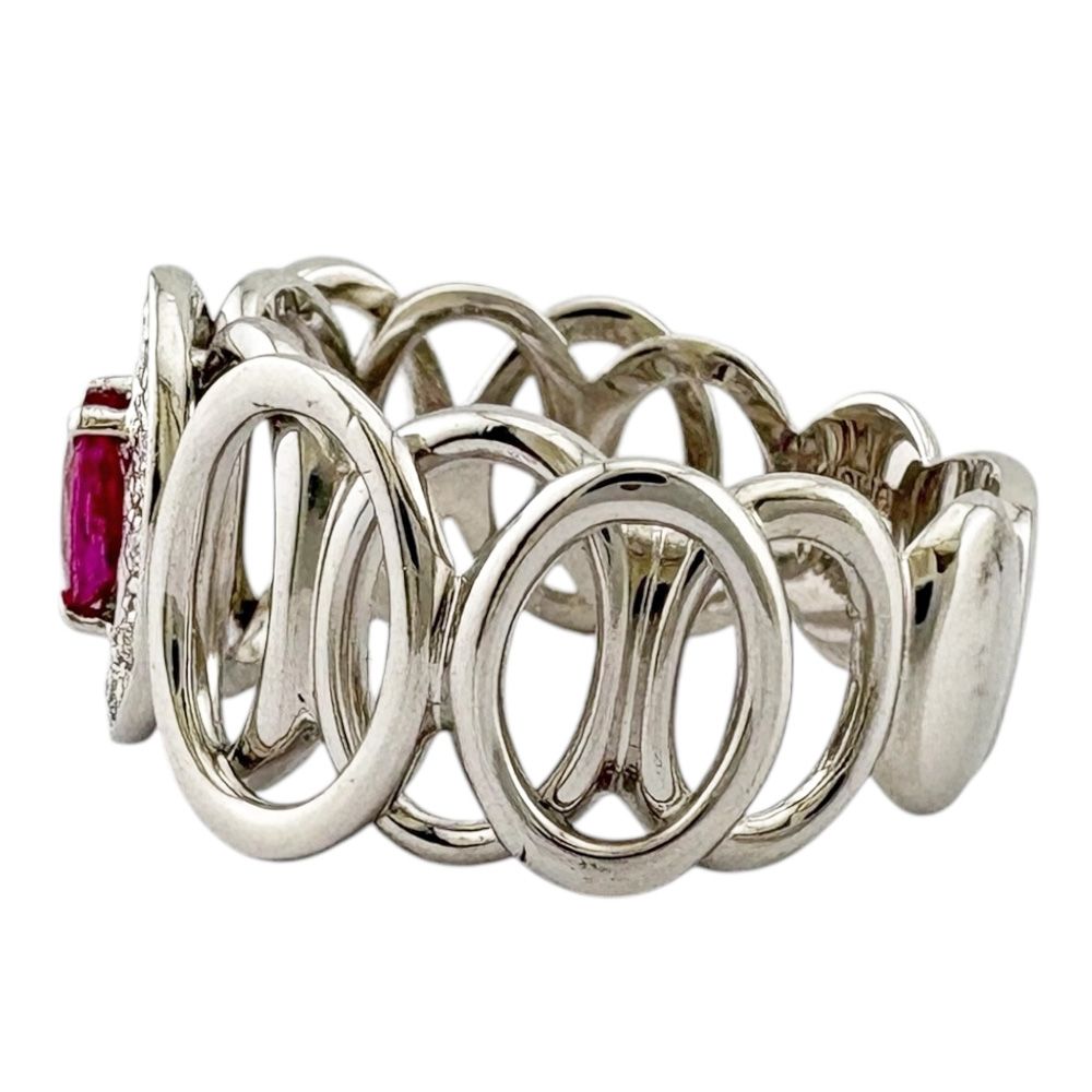 鮮烈なルビーをダイヤモンドのヘイローが取り巻き、K18ホワイトゴールドの芸術的な透かし細工が指元を彩る個性豊かなリングです。 ゴージャスでありながら軽やかなデザインが、大人の女性の指先に華やかさと品格をもたらします。