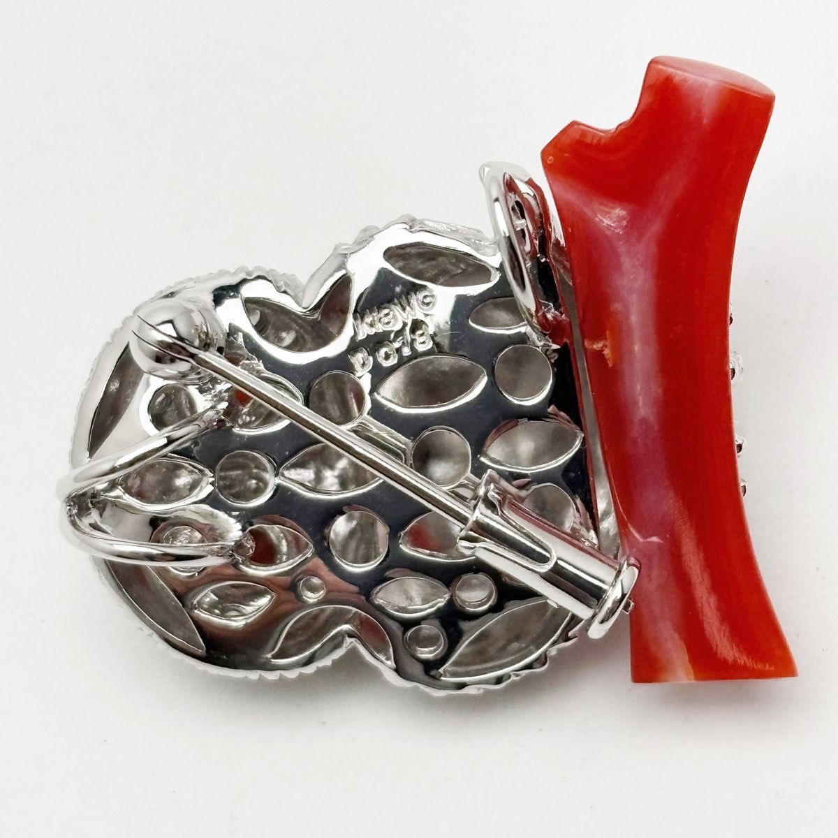 フクロウ 梟 ブローチ K 18 WG ダイヤモンド 血赤サンゴ