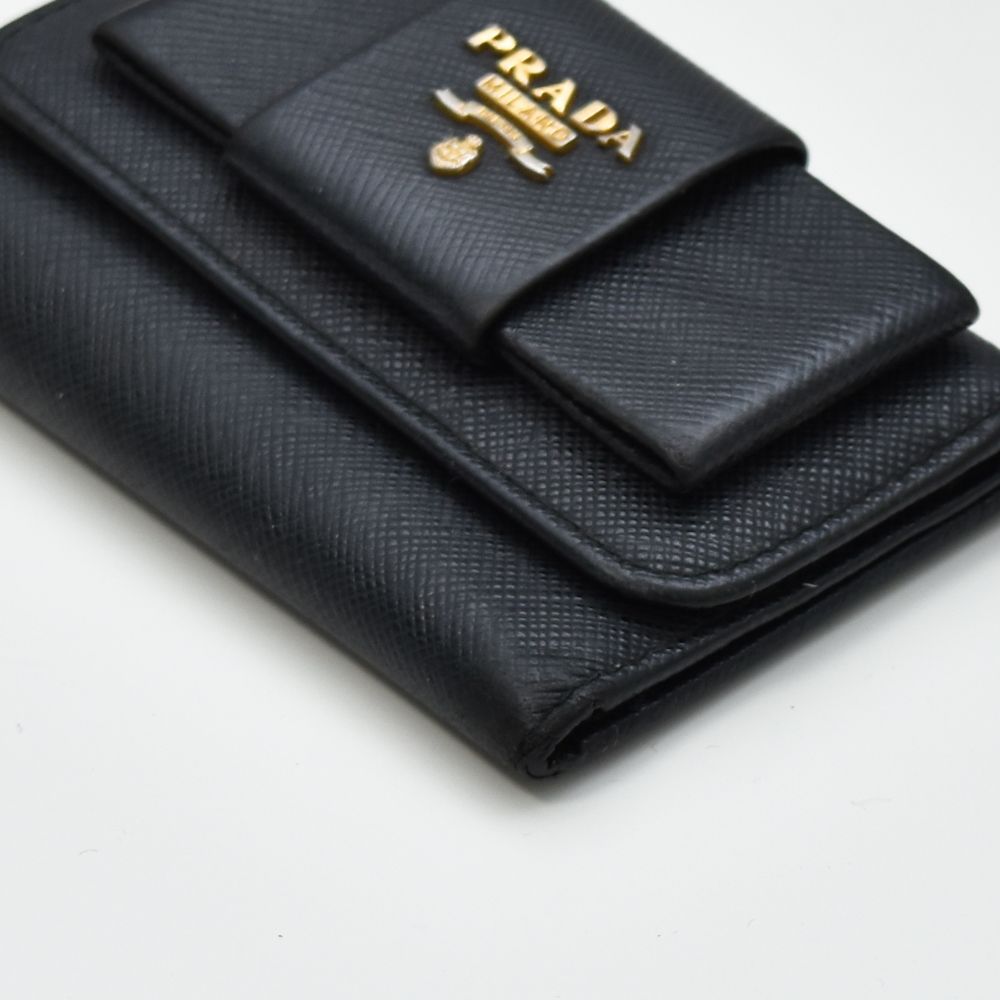 PRADAのリボンモチーフキーケース。6連仕様になっており高級感のあるサフィアーノレザーが施されています。内側とPRADAロゴにスレがあり使用感ございますが、レザーにあまりへたりも無くボタンもしっかりと止まり、まだまだお使いいただけます。
