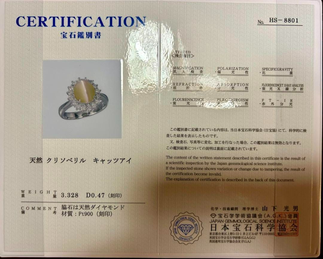 pt 900 ミルク-ハニー クリソベリルキャッツアイ3.328 ct ダイヤモンド リング 指輪|鑑別書付き