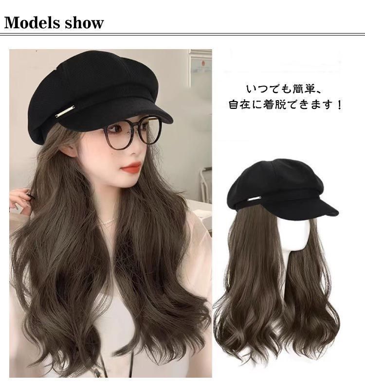 ベレー マジックテープ ウィッグ付き帽子 ストレート 髪付き帽子 帽子ウィッグ ウィッグ ロング 取り付け便利 かつら 帽子付きウィッグ 髪の毛 小顔効果 ベレー帽 ウェーブ 秋 自然 暖か kongban 410