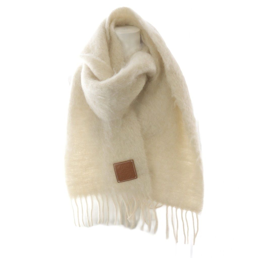 ロエベ LOEWE アナグラム レザーパッチ ウール モヘヤ マフラー フリンジ ベージュ