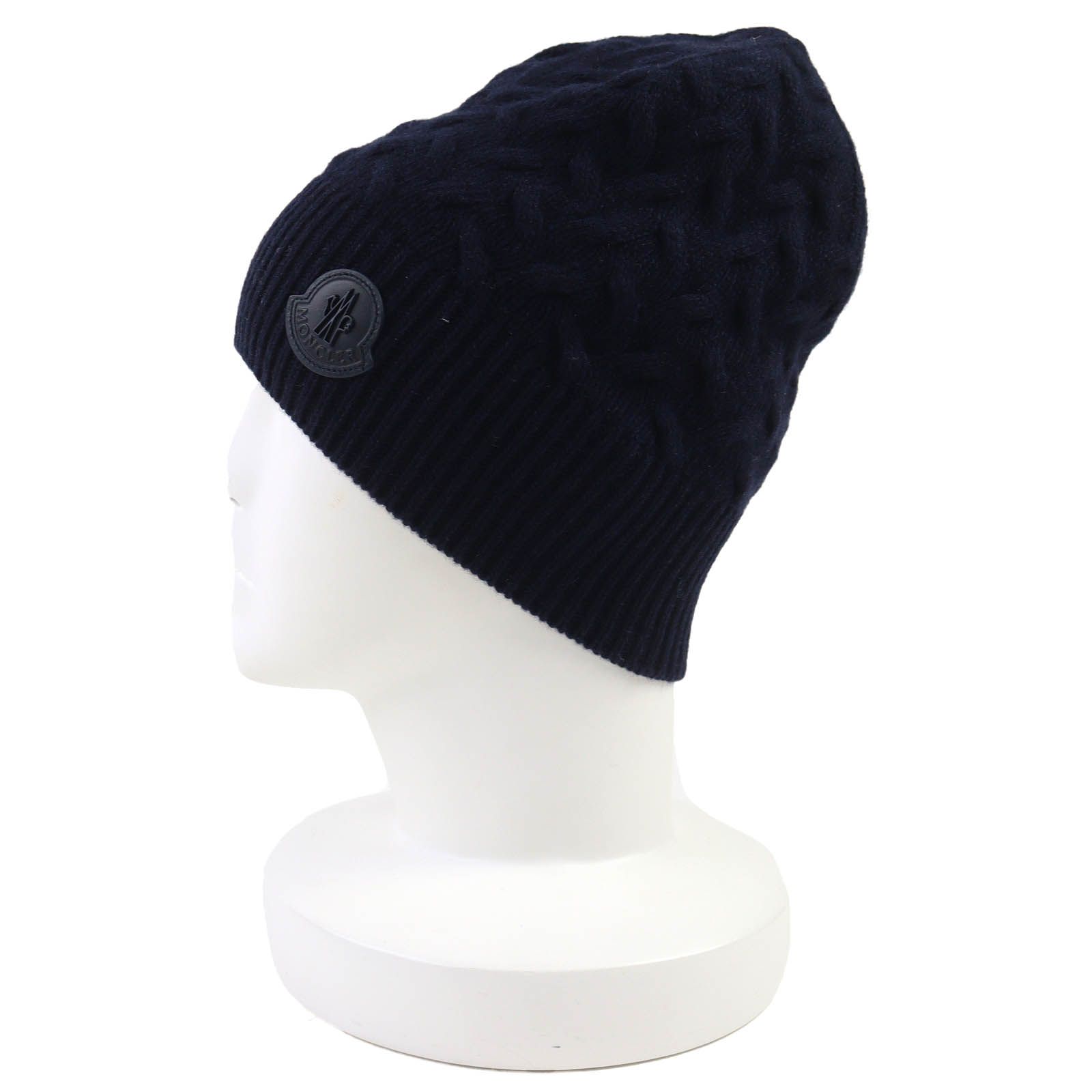 △MONCLER モンクレール 2025年製 ウール100% ロゴレザーワッペン ビーニー ニット帽 ニットキャップ ネイビー イタリア製 レディース