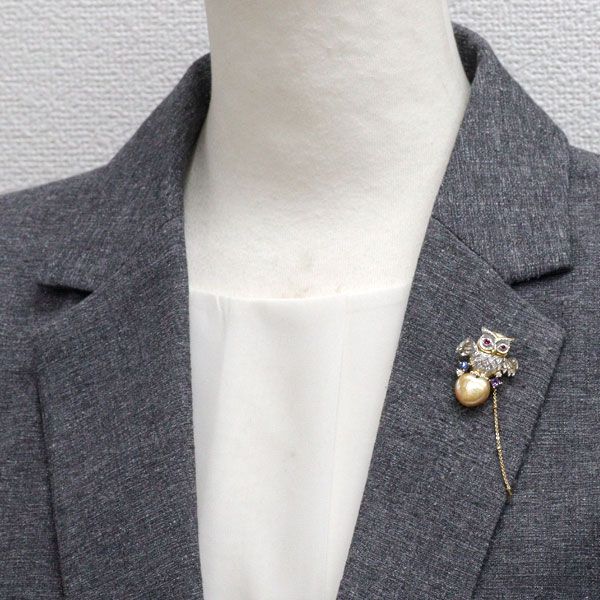梶光夫 K 18 YG WG ゴールデンパール ルビー サファイア ダイヤモンド ブローチ D 0.16 ct ふくろう